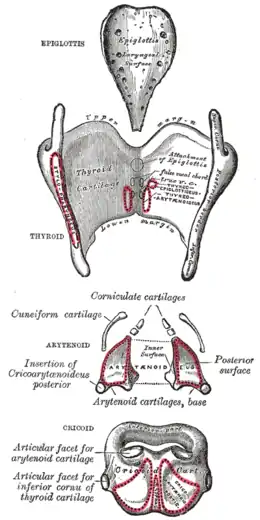 Il s'articule également avec le cartilage épiglottique en haut et est relié à lui par le ligament thyro-épiglottique.