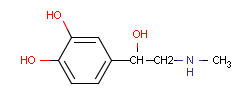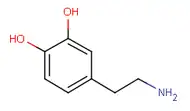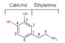 La structure des catécholamines est basée sur un noyau catéchol portant en position 1 une chaîne latérale éthylamine éventuellement substituée. Le noyau catéchol est caractérisé par la présence de deux groupements hydroxyles adjacents sur un noyau benzénique en position 3 et 4.