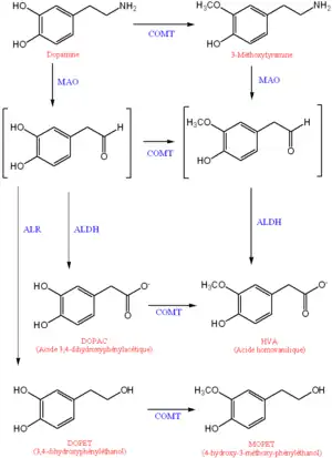 L'action de la COMT sur l'adrénaline et la noradrénaline conduit respectivement à la métanéphrine (MN) et à la normétanéphrine (NMN). Ces deux métabolites subissent alors l'action de la MAO et sont transformés en acide vanillyl-mandélique (VMA). L'action des enzymes MAO et COMT sur la dopamine conduit à l'acide homovanilique (HVA).