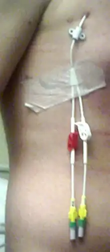 Les complications potentielles du placement d'un tel cathéter comprennent l'hémorragie et un pneumothorax lors de l'insertion et la thrombose ou une infection à un stade ultérieur. Les patients avec une cathéter tunnelisé nécessitent donc un rincement périodiques de celui-ci avec de l'héparine, pour éviter qu'il ne soit bouché par des caillots de sang.