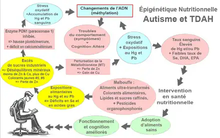 Selon Dufaut et al. (2024, voie schéma ci-join), certains colorants alimentaires (ex : jaune n° 5 et jaune n° 6), les lipides et sucres raffinés (ex : sirop de maïs à haute teneur en fructose (SHF) et les pesticides présents dans les aliments ultra-transformés exposent au mercure inorganique (Hg), au plomb (Pb) et à des déficits alimentaires en acides gras importants (DHA, EPA) et en micronutriments essentiels (ex :sélénium) qui induisent des déséquilibres minéraux (ex : déficit en zinc (Zn) et/ou de calcium (Ca), et trop de cuivre (Cu), ce qui inhibe les métallothionéine (MT), et entraine une hausse des métaux lourds/métalloïdes dans l’organisme, sources de stress oxydatif et d’anomalies de méthylation de l’ADN, pouvant affecter la santé et la cognition. ex : un manque de calcium peut augmenter le Plomb sanguin et inhiber la fonction du gène paraoxonase-1 (PON-1, impliqué dans la détoxification des résidus neurotoxiques d'organophosphorés) ; sans une activité adéquate du gène PON1, les résidus alimentaires de pesticides OP causent un stress oxydatif et des méthylations de l'ADN affectant la santé et la cognition des enfants, sur plusieurs générations[133]
