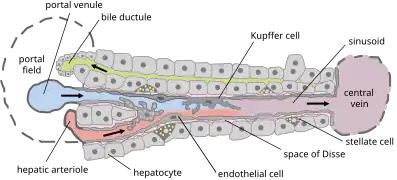 On retrouve des cellules de Küpfer dans les capillaires à endothéliums discontinus ou sinusoïdes (lame basale discontinue), qui irriguent et drainent le foie, plus précisément dans ce qu'on appelle : l'espace de Disse[10]. L'espace de Disse est situé entre un hépatocyte et un vaisseau sanguin. Cet espace comprend également des cellules d'Ito (ou cellules stellaires)[réf. souhaitée]. La cohésion de cet ensemble est assuré par un feutrage de collagène III. Ce schéma est retrouvé dans les organes type lymphoïdes et hématopoïétique, comme le foie et la rate[réf. souhaitée].