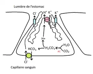 Le H+ ainsi formé peut ainsi être expulsé au pôle apical par la pompe à proton, où il intègre la lumière des glandes fundiques pour se retrouver finalement dans la lumière de l'estomac et vient se mélanger au bol alimentaire. Le HCO3- formé est expulsé au pôle basal de la cellule grâce à l'échangeur HCO3-/Cl-. Le Cl- passe au pôle apical et traverse la membrane apicale pour se joindre aux produits de sécrétions via une conductance au chlore. Le produit de sécrétion des cellules pariétales est donc le HCl, bien qu'il soit directement dissocié en H+ et Cl-.