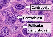 Un centrocyte, un centroblaste et une cellule dendritique folliculaire, observés dans un lymphome folliculaire.