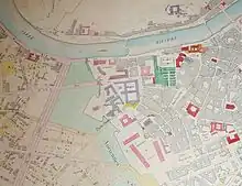 Site des hôpitaux en 1878: en violet au centre, les hôpitaux civil et militaire