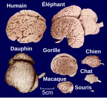 Le cortex cérébral est la région du cerveau qui distingue au mieux le cerveau des mammifères de celui des autres vertébrés, celui des primates de celui des autres mammifères, et celui des humains de celui des autres primates. Le rhombencéphale et le mésencéphale des mammifères est généralement similaire à celui des autres vertébrés, mais des différences très importantes se manifestent au niveau du prosencéphale qui n'est pas seulement beaucoup plus gros mais présente également des modifications dans sa structure[36]. Chez les autres chordés, la surface du télencéphale est recouverte d'une simple couche, le pallium[37]. Chez les mammifères, le pallium a évolué en une couche à six feuillets appelée néocortex. Chez les primates, le néocortex s'est grandement élargi, notamment au niveau de la région des lobes frontaux. L'hippocampe des mammifères a également une structure bien particulière.