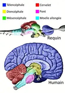 Les principales divisions de l'encéphale représentées sur un cerveau de requin et un cerveau humain.