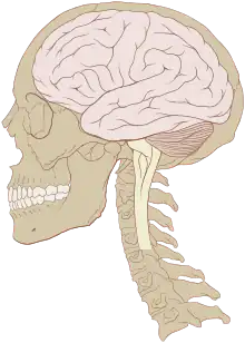 Le cerveau de l'ensemble des chordés présente fondamentalement la même structure[17]. Il est constitué d'un tissu mou d'une texture gélatineuse[18]. De manière générale, le tissu cérébral vivant est rosâtre à l'extérieur et blanchâtre à l'intérieur. Le cerveau des chordés est enveloppé d'un système membranaire de tissu conjonctif, les méninges, qui sépare le crâne du cerveau[19]. De l'extérieur vers l'intérieur, les méninges sont composées de trois membranes : la dure-mère, l'arachnoïde et la pie-mère. L'arachnoïde et la pie-mère sont étroitement connectées entre elles et peuvent ainsi être considérées comme une seule et même couche, la pie-arachnoïde. Compris entre l'arachnoïde et la pie mère, l'espace sous-arachnoïdien contient le liquide cérébro-spinal qui circule dans l'étroit espace entre les cellules et à travers les cavités appelées système ventriculaire. Ce liquide sert notamment de protection mécanique au cerveau en absorbant et amortissant les chocs et à transporter hormones et nutriments vers le tissu cérébral. Les vaisseaux sanguins viennent irriguer le système nerveux central à travers l'espace périvasculaire au-dessus de la pie-mère. Au niveau des vaisseaux sanguins, les cellules sont étroitement jointes, formant la barrière hémato-encéphalique qui protège le cerveau en agissant comme un filtre vis-à-vis des toxines susceptibles d'être contenues dans le sang.