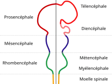 Chez les chordés, les premières étapes du développement sont communes à toutes les espèces[47]. Tandis que l'embryon passe d'une forme ronde à une structure de type vermiforme, une étroite bande de l'ectoderme se décolle de la ligne médiane dorsale pour devenir la plaque neurale, précurseur du système nerveux. La plaque neurale se creuse, s'invagine de manière à former la gouttière neurale puis, les plis neuraux qui bordent la gouttière fusionnent pour fermer la gouttière qui devient le tube neural. Ce tube se subdivise ensuite en une partie antérieure renflée, la vésicule céphalique primitive, qui se segmente en trois vésicules qui deviendront le prosencéphale, le mésencéphale, et le rhombencéphale[47]. Le prosencéphale se divise ensuite en deux autres vésicules, le télencéphale et le diencéphale tandis que le rhombencéphale se divise en métencéphale et myélencéphale. Chacune de ces vésicules contient des zones prolifératives dans lesquelles neurones et cellules gliales sont formés. Ces deux types de cellules migrent ensuite, parfois sur de longues distances, vers leurs positions finales.