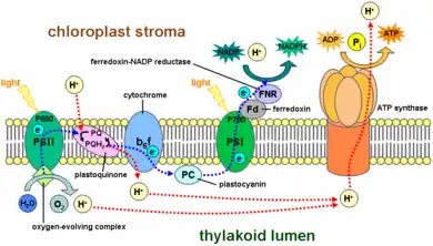 - photophosphorylation cyclique : (ferrédoxine →) plastoquinone → cytochrome b6 → cytochrome c6 → photosystème I (P700 (en)) → ferrédoxine (→ plastoquinone).