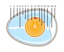 Les deux chalazes dans les œufs d'oiseaux et de reptiles sont des cordons d'albumine fixés à la membrane coquillière interne qui maintiennent le jaune suspendu dans l'œuf et orientent l'axe antéro-postérieur de l'embryon perpendiculairement au grand axe de la coquille (grâce à l'enroulement senestre de la chalaze à droite de l'embryon, dextre à gauche). Ce réseau de fibres tordues sur elles-mêmes en spirale est semblable à un ressort[5]. Certains animaux, tel le Pogona viticeps, pondent des œufs qui ne possèdent pas de chalaze.
