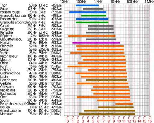 Plusieurs espèces animales entendent des fréquences bien au-delà de la portée auditive de l'homme. Certains dauphins et certaines chauves-souris, par exemple, peuvent entendre des fréquences allant jusqu'à 100 000 Hz. Les éléphants peuvent entendre des sons de 14 à 16 Hz, tandis que certaines baleines peuvent entendre des infrasons aussi bas que 7 Hz (dans l'eau).