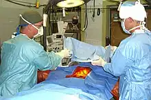 Une équipe chirurgicale met en place les champs opératoires stériles.