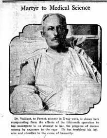 Dès le début, les accidents radiographiques[3] apparaissent. Les patients soumis à des longues expositions aux rayons X sont parfois victimes de brûlures superficielles (en 1897, un cliché de bassin nécessitait trente à quarante minutes d'exposition !). Mais les examens terminés, quelques semaines après, l'épiderme se reconstitue. Les opérateurs occupés chaque jour aux réglages des tubes radiogènes ne se préoccupent pas immédiatement des conséquences graves auxquelles ils s'exposent. Ainsi, beaucoup de praticiens, victimes de radiodermite[4] voient leur épiderme se fendiller, leurs ongles tomber, des ulcérations se former. Charles Vaillant est amputé de l'index droit en 1906. En 1910, il perd l'index gauche. À Lariboisière, la situation du laboratoire s'améliore. Bien qu'insuffisante, la subvention que reçoit Charles Vaillant lui permet de faire fonctionner deux installations. En effet, il est devenu chef de service de radiographie de Lariboisière et de la Maison municipale de Santé. Il a également été nommé expert près du Tribunal civil de la Seine.