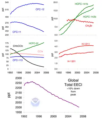 Certains CFC sont de puissants gaz à effet de serre et sont en outre responsables, pour une bonne part, de la destruction de la couche d'ozone stratosphérique — couche qui protège les écosystèmes des effets délétères des UV solaires et évite aux humains de nombreux cancers de la peau et des dégâts oculaires et immunitaires. Chaque atome de chlore issu de la décomposition de CFC en altitude détruirait en moyenne cent mille molécules d'ozone[5]. Le brome, bien moins abondant que le chlore, est cependant 45 à 60 fois plus efficace que lui (par atome) pour détruire l'ozone stratosphérique. On combine leurs effets pour donner un indice global en « équivalent-chlore » ; dont le pic planétaire a eu lieu entre mi-1992 et mi-1994[2].