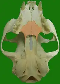 Vue inférieure d’un crâne de chat, montrant les choanes (en pointillé), les os palatins (en rose) et le vomer (en bleu).