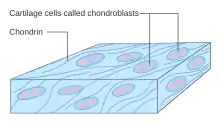 Les chondroplastes contiennent des chondroblastes qui sont de futurs chondrocytes. Les chondroblastes sont des cellules arrondies dont la membrane plasmique porte des microvillosités irrégulières au contact de la substance fondamentale et dont le cytoplasme est basophile. Les chondroblastes ont une synthèse protéique importante, à l'origine de la matrice extracellulaire particulièrement développée dans le cartilage.