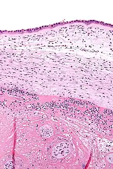 Histopathologie de la chorioamnionite. L'amnios (partie haute de l'image) présente des neutrophiles épars, ce qui permet de diagnostiquer une chorioamnionite.
