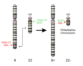 Comme dit précédemment, le chromosome Philadelphie résulte d'un remaniement chromosomique appelé translocation réciproque. Un segment des chromosomes 9 et 22 s'interchangent et prennent la place l'un de l'autre. Ceci résulte en la fusion d’une partie du gène BCR (breakpoint cluster region) sur le chromosome 22 avec une partie du gène ABL1 (Abelson) sur le chromosome 9. La protéine de fusion issue de ce gène BCR-ABL1 est une protéine intracellulaire ayant une activité tyrosine kinase constitutionnelle dérégulée, contrairement celle de la protéine ABL1 normale. En fonction de la position exacte des points de cassure, le poids moléculaire de la protéine varie entre 185 et 210 kDa, constituant des isoformes distinctes avec des caractéristiques cliniques particulières. Les points de cassure peuvent entraîner des transcrits de fusion différents, dont des transcrits majeurs (Major-BCR-ABL1) qui représentent 95 % des transcrits de fusions retrouvés et des transcrits mineurs (minor-BCR-ABL1).
