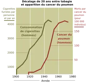Au début du XXe siècle, le tabac est cultivé et consommé sur tous les continents. Les progrès techniques et industriels font évoluer sa production et la consommation de cigarettes supplante dès lors la chique, la prise, la pipe et le cigare. En 1880, il est vendu cent millions de cigarettes dans le monde, en 1900 un milliard de cigarettes[38]. Sa consommation se diffuse massivement au milieu du XXe siècle avec l'essor de la publicité. En 1940, 1 000 milliards de cigarettes sont vendues dans le monde, 2 000 milliards en 1960, 5 000 milliards en 1980, 6 000 milliards en 2014[39].