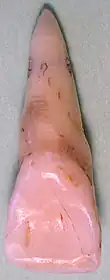 Vue linguale (intérieure) d’une incisive supérieure. Le cingulum est près de la base.