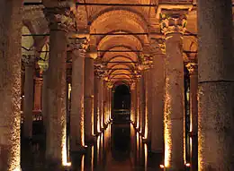 Les Romains à partir du IVe siècle av. J.-C. aménagent des citernes, qui à partir du IIIe siècle récoltent l'eau des toits via un compluvium. Les édifices publics également stockent l'eau, comme dans les thermes du forum de Pompéi, qui en -80 établissent une citerne de 15 x 5 x 9 mètres de haut[3]. Palladius au (Ve siècle) décrit l'établissement d'une citerne : la citerne est en opus signinum (Signinis parietibus), type de bétonnage originaire de la ville de Segni décrit par Vitruve[note 1], aussi la plus ancienne mention du mot beton par Philibert Monet[4], constitué de chaux, de sable et d'éclats de pierre, exempte de tuileaux, dont la compacité était obtenue au terme d’un damage intensif[5]. Pour étancher les murs des citernes, Palladius préconise de couvrir le mortier de tuileau (testacei pavimenti) dont on pare aussi les ouvrages d'eau comme les aqueducs, d'une couche de graisse de lard (lardo pingui). L'enduit-mastic appelé maltha, ici une composition de poix (picis liquidae, de la poix liquide distillée à partir de résine de pin) et de suif, additionné de chaux sert à colmater les fuites. L'eau est amenée à la citerne par des tuyaux d'argile (tubos fictiles):