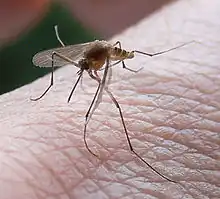 Le climat peut également affecter la santé humaine de façon indirecte à travers les animaux. Le changement climatique provoque l'émergence de nouvelles maladies chez les animaux dont certaines sont transmissibles à l'homme[9]. Accompagné de modifications dans les températures, les précipitations et l'humidité qu'il entraîne, le changement climatique pèse sur le devenir de certaines maladies infectieuses et parasitaires qui affectent l'ensemble du monde vivant. Ce changement perturbe surtout la composition des écosystèmes et les interactions entre espèces. Il intervient donc sur plusieurs aspects des populations d'espèces vectrices et réservoirs et donc sur les virus, bactéries ou parasites pathogènes. D'après plusieurs études scientifiques récentes, les changements de température sont donc responsables de l'extension et même de l'apparition de maladies qui sont transmises par des animaux vecteurs responsables de l'évolution géographique et temporelle de maladies infectieuses et parasitaires. On peut citer comme exemple la malaria (ou paludisme ) qui est sans doute la maladie à transmission vectorielle la plus sensible à un changement climatique. Transmise par des moustiques, cette maladie tue plus d'un million de personnes par an, la population la plus affectée étant les enfants africains de moins de 5 ans[10]. Les pluies abondantes de mousson et la forte humidité sont identifiées comme les facteurs ayant une influence majeure sur la reproduction et la survie de ces moustiques. Il existe également une maladie qui évolue très sensiblement au changement climatique : la Fièvre de la Vallée du Rift[N 4] qui est une maladie qui touche principalement les animaux et peut aussi contaminer l'homme. Elle semble évoluer vers le nord et au-delà de la Méditerranée et de la mer d'Arabie, ce qui pourrait avoir des conséquences très graves et imprévisibles sur la santé humaine. Le changement de climat et surtout le réchauffement climatique sont donc des éléments qui favorisent l'émergence et l'expansion de maladies animales dont certaines sont transmissibles à l'homme.