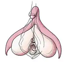 Le clitoris présente un capuchon qui est l'équivalent du prépuce du pénis, qui recouvre le gland. Il possède également une tige qui est attachée au gland. Les corps caverneux masculins sont homologues aux corps caverneux clitoridiens, le corps spongieux est homologue aux bulbes vestibulaires situés sous les petites lèvres, le scrotum est homologue aux grandes lèvres et le raphé périnéal est homologue aux petites lèvres[6],[13].