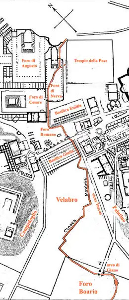 et de l'embouchure de la Cloaca Maxima dans la Rome antique (en rouge) |