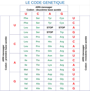 La correspondance entre codons d'ARN messager et acides aminés protéinogènes est généralement présentée sous forme de tableaux associant chacun des 64 codons, ou triplets de quatre bases nucléiques possibles (43 = 64), avec l'un des 22 acides aminés protéinogènes.