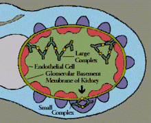 - Soit l'antigène est en excès et dans ce cas les complexes sont solubles dans le sérum sanguin et restent en circulation. Ils sont alors susceptibles de provoquer des phénomènes morbides (à l'origine de maladie). Ces affections peuvent être « mineures » quand l'antigène possède un faible poids (moléculaire) dû au fait que les complexes se déposent tardivement de façon morcelée susceptibles alors d'être détruits par les globules blancs grâce à la phagocytose. Dans certains cas l'antigène possède un poids (moléculaire) important associé une grande taille. Dans ces circonstances on constate une précipitation rapide (dépôt) et une mise en branle rapide de l'action du complément ce qui entraîne des altérations des petits vaisseaux et plus précisément de leurs parois concernant certains organes comme les reins. Ce type de phénomène constitue l'hypersensibilité de type III ou semi tardive. Chez certains patients on constate un emballements de ce phénomène ce qui aboutit à des lésions d'autres organes tels que la peau et les artères. C'est ce que l'on constate au cours de l'angéite allergique ou de la maladie à précipitines. Le complément est un facteur qui intervient en cascade pour activer une réaction immunitaire.