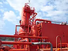 Système de récupération des gaz (COV, Composé Organique Volatil) sur le pétrolier Juanita. Les gaz qui autrefois s'échappaient des cuves (jusqu'à 100 t par voyage) sont reliquéfiés, limitant ainsi la pollution et les pertes (avril 2006).