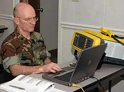 Un hygiéniste industriel, attaché à une Unité de médecine dite (FDPMU-7 : Forward Deployed Preventive Medicine Unit Seven) prépare une formation à l'utilisation d'un matériel de détection de COV dans les sols, l'eau ou l'air afin d'y détecter d'éventuels toxiques chimiques, radiologiques ou agents biologiques. Norfolk, Virginie (24 juin 2006).
