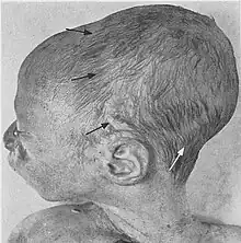 Dans Treatise on the theory and practice of Midwifery, William Smellie observe que durant les accouchements prolongés, lorsque la tête de l'enfant s'est trouvée dans le bassin de sorte que les os se chevauchent les uns sur les autres et que la forme s'est allongée, le cerveau est tellement comprimé que des violentes convulsions surviennent avant ou peu après l'accouchement, et peuvent entrainer le décès de l'enfant[8].