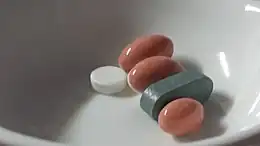 Le comprimé est enrobé, pour obtenir un effet particulier (comme la gastro-résistance) ou pour cacher la couleur ou un goût désagréable ou encore, avoir une couleur « commerciale »[15], par exemple le Viagra est bleu de la couleur du logo du laboratoire qui le commercialise. Le comprimé est lisse et brillant.- Comprimé pelliculé (ou filmé)