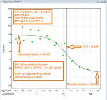 La CI50 d'un médicament peut être déterminée en construisant une courbe de réponse et en examinant l'effet de différentes concentrations d'un antagoniste sur l'inversion de l'activité d'un agoniste. Les valeurs de la CI50 peuvent être calculées pour un antagoniste donné en déterminant la concentration nécessaire pour inhiber la moitié de l'effet biologique maximal de l'agoniste considéré[2].