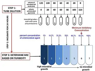 Trois réactifs principaux sont nécessaires pour exécuter ce test : un milieu de culture, un agent antimicrobien et le microbe que l'on veut tester. Le milieu le plus couramment utilisé est le bouillon de Mueller Hinton à cations ajustés, en raison de sa capacité à soutenir la croissance de la plupart des agents pathogènes et du fait qu'il ne contient pas d'inhibiteurs envers les antibiotiques courants[17]. Selon l'agent pathogène et les antibiotiques testés, le milieu peut être changé et/ou ajusté (au niveau de la concentration de ses composés). La concentration d'antimicrobiens est ajustée à la concentration correcte d'intérêt en mélangeant l'antimicrobien d'origine avec le milieu. L'antimicrobien ajusté est dilué en série dans plusieurs tubes (ou puits lorsqu'on travaille en microplaques) pour obtenir un gradient. Le taux de dilution peut être ajusté en fonction du point d'arrêt et des besoins du praticien. Le microbe, ou l'agent d'inoculation, doit provenir de la même unité formant colonie et doit être à la bonne concentration. Cela peut être ajusté par le temps d'incubation et la dilution. Pour vérification, le contrôle positif est repiqué sur plaque dans une dilution au centuple pour compter les unités formant colonie. On inocule les microbes dans les tubes (ou la plaque) et on les incube pendant 16 à 20 heures. La CMI est généralement déterminée par la turbidité : un milieu trouble signifiera que la culture a poussé et donc que la concentration n'est pas assez importante ; à l'inverse, un milieu transparent sera la preuve que la culture n'a pas poussé.
