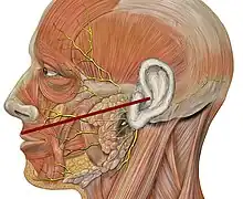 Sa direction correspond à celle d'une ligne horizontale passant par le tragus et le bord inférieur de l'aile du nez. L'artère transversale de la face passe au dessus de ce canal [3].