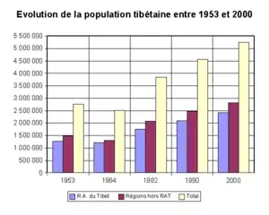 Selon la Chine, entre 1953 et 2000 la population d'ethnie tibétaine en Chine a doublé, passant de 2 775 000 à 5 416 021, comme elle a aussi doublé dans la seule région autonome du Tibet, passant de 1 273 964 à 2 427 168[23],[24].