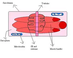 La structure est très particulière et on peut distinguer deux parties : les citernes terminales, gros renflements situées de part et d’autre des tubules T, et le réticulum sarcoplasmique longitudinal, fin réseau reliant les citernes terminales. Cette différence structurale est assortie d’une différence fonctionnelle, les citernes terminales étant plus spécialement impliquées dans la libération du calcium et le réticulum sarcoplasmique longitudinal dans sa recapture ou repompage.