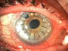 Greffe récente de la cornée, montrant ses points de suture - La dystrophie de Fuchs[4],[5].