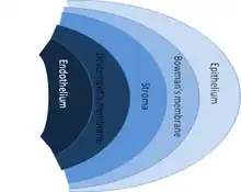 La cornée est composée de quatre couches de cellules et de 2 membranes. De la superficie vers l'humeur aqueuse :