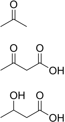 Les deux premiers corps cétoniques, l'acétoacétate et le β-D-hydroxybutyrate, sont utilisés comme sources d'énergie par le cœur et le cerveau, tandis que le troisième, l'acétone, est un produit de dégradation de l'acétylacétate dont les mesures par radiotraceurs montrent qu'elle est excrétée par l'organisme à hauteur de 2 à 30 %.