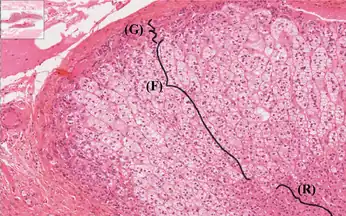 Le cortex surrénal dérive du mésoderme[4]. Il est composé de cellules glandulaires endocrines à sécrétion lipidique divisé en trois zones qui se répartissent en trois couches successives :