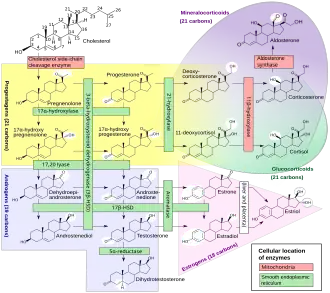 Dans la corticosurrénale, le cholestérol est métabolisé en prégnénolone par le cytochrome P450scc mitochondrial. Il passe ensuite successivement par les stades :