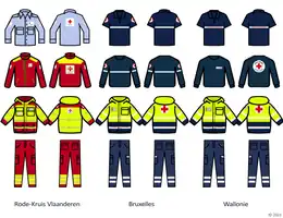 | Directeur des opérations (DIR OPS) | Brevet de secourisme et formation interne | ![]() Gilet jaune et orange fluorescents haute visibilité porté comme uniforme de la Croix-Rouge de Belgique par le Directeur des opérations à Bruxelles et en Wallonie. | ||