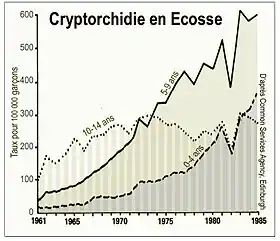 Variation de prévalence (pour 3 classes d'âge) de cryptorchidies détectées en Écosse (cas diagnostiqués en service néonatal, puis en médecine scolaire). Les orchidopexies ont connu des variations comparables[2].