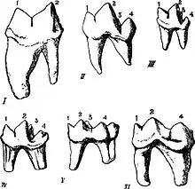 La morphologie de la couronne, le nombre, la forme et la disposition des cuspides des dents jugales, le nombre et la longueur de leurs racines et l'épaisseur de l'émail dentaire renseignent sur l'espèce de vertébré (vivant ou fossile) et son régime alimentaire[2].