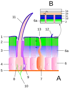 A : Cuticule et épiderme ; B : Détails de l'épicuticule. 1 : Épicuticule ; 1a : Cément ; 1b : Cire ; 1c : Épicuticule externe ; 1d : Épicuticule interne. 2 : Exocuticule ; 3 : Endocuticule ; 2+3 : Procuticule ; 4 : Épiderme ; 5 : Membrane basale ; 6 : Cellule de l'épiderme ; 6a : Canal sécréteur de cire ; 7 : Cellule glandulaire ; 8 : Cellule trichogène ; 9 : Cellule tormogène ; 10 : Nerf ; 11 : Sensille ; 12 : Poil ; 13 : Pore glandulaire.