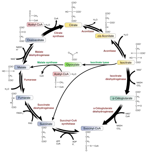 Cycle de Krebs avec ses huit enzymes nommées en rouge et, à l'intérieur de celui-ci, le cycle du glyoxylate participant à l'anabolisme des plantes, des champignons, des protistes et des bactéries.